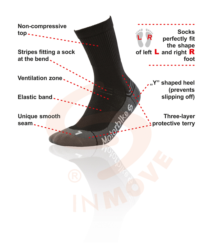 The three-layer inner terry absorbs shocks and protects sensitive areas of feet and ankles against abrasions and injuries. Modern structure of the Prolen® SILTEX fibre ensures that moisture is taken away from the skin and that feet are always dry. Ventilation area together with Prolen® SILTEX action additionally accelerates transportation of moisture away. The socks are very light but several times more durable than their cotton counterparts. The socks are designed to fit the anatomical shape of the left (L) and right (R) foot through the proper shaping of the terry fabric. Lycra® in the entire fabric ensures firm grip to the leg. The elastic band on the mid-foot protects the sock against shifting on the foot. The appropriately shaped knitted material on the heel (shape "Y") perfectly fits and stabilizes the foot. Crosswise ribs facilitate fitting the sock on bend of the foot. The unique 'PATENT ROSSO' technology with the seam of the sock above the toes makes you hardly feel that the seam is there and gives you the highest possible comfort. The socks act as a deodorant due to content of SILVER in the Prolen® SILTEX yarn. The prevention of unpleasant odour during use is a result of anti-microbial properties of silver.