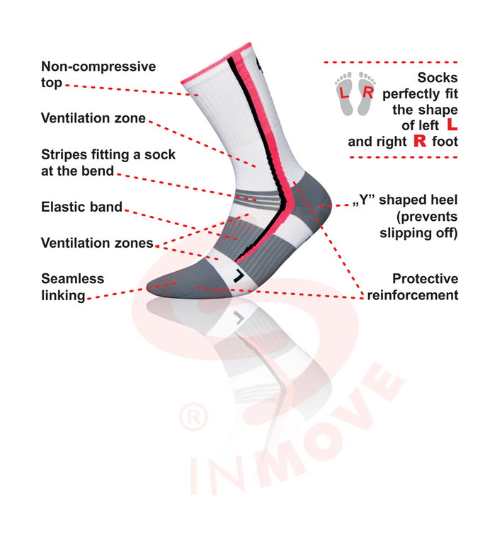 The three-layer inner terry absorbs shocks and protects sensitive areas of feet and ankles against abrasions and injuries. Modern structure of the Prolen® SILTEX fibre ensures that moisture is taken away from the skin and that feet are always dry. Light fabric above the foot, together with Prolen® SILTEX action additionally accelerates transportation of moisture away. The socks are very light but several times more durable than their cotton counterparts. The socks are designed to fit the anatomical shape of the left (L) and right (R) foot. Lycra® in the entire fabric ensures firm grip to the leg. The elastic band on the mid-foot protects the sock against shifting on the foot. The appropriately shaped knitted material on the heel (shape "Y") perfectly fits and stabilizes the foot. Crosswise ribs facilitate fitting the sock on bend of the foot. The comfort features are rounded up by a seamless linking above the toes. The socks act as a deodorant due to content of SILVER in the Prolen® SILTEX yarn. The prevention of unpleasant odour during use is a result of anti-microbial properties of silver.