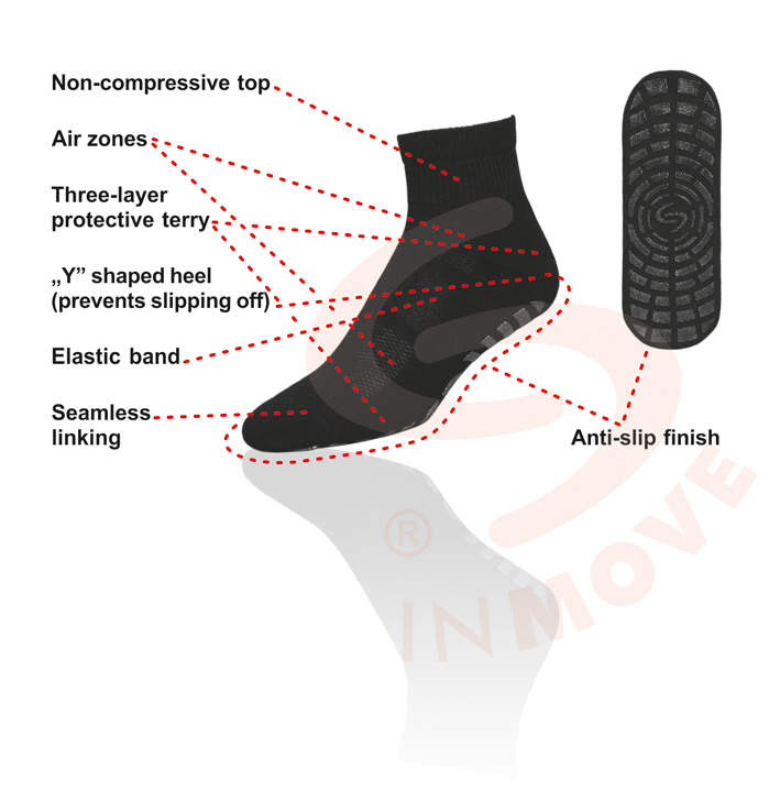 Socks designed to be used without footwear, especially for exercise and gyms. Silicone finish on the sole prevents slipping. Three-layer terry fabric protects sensitive parts of feet. Fine and cool fabric over the foot ensures humidity evaporating and proper ventilation. Toes are seamlessly linked. The elastic band on the mid-foot protects the sock against shifting on the foot even in case of sudden movements. Appropriately shaped knitted material on the heel (Y-shaped), perfectly fits and stabilizes the foot. The socks have antibacterial, antifungal and anti-odour properties, ensuring maximum hygienic advantages.