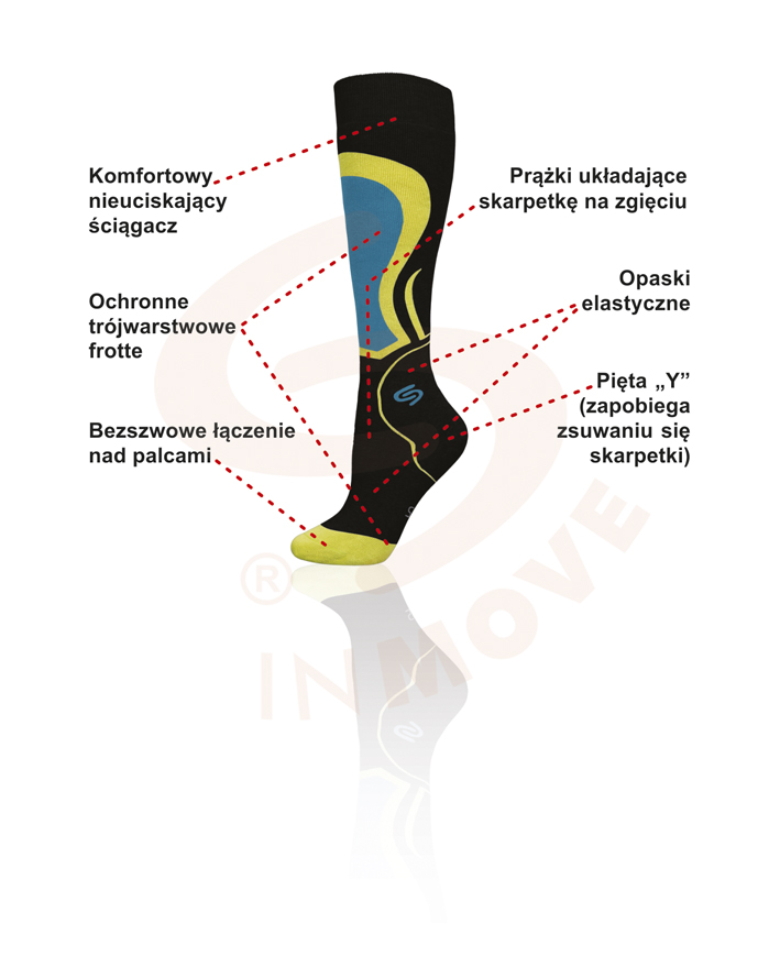 Trójwarstwowa profilowana dzianina frotte chroni części nogi narażone na urazy i otarcia podczas jazdy na nartach. Bezszwowe łączenie zapewnia maksymalny komfort, zapobiegając powstawaniu otarć nad palcami, nawet w ekstremalnych warunkach. Zawartość przędzy Lycra® w całym wyrobie zapewnia idealne przyleganie do nóg. Komfortowy ściągacz nie powoduje nadmiernego ucisku, utrzymując doskonale skarpetkę na nodze. Dwie opaski elastyczne, na stopie i nad kostką, zapobiegają przesuwaniu się podkolanówek nawet podczas gwałtownych ruchów. Odpowiednio wyprofilowana dzianina na pięcie (kształt "Y"), doskonale przylega do stopy i stabilizuje ją. Poprzeczne prążki ułatwiają układanie się podkolanówki na zgięciu nogi. Szwajcarska apretura Sanitized® zapewnia trwałe działanie antybakteryjne, antygrzybicze i antyzapachowe.