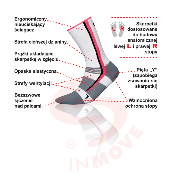 Cienkie skarpetki do jazdy na rowerze. Wzmocniona dzianina chroni spód stopy i ścięgno Achillesa. Wykorzystanie nowoczesnej konstrukcji włókna PROLEN® SILTEX sprawia, że wilgoć odprowadzana jest do warstw oddalonych od skóry, zaś stopy pozostają zawsze suche. Cienka, przewiewna dzianina nad stopą wraz z działaniem przędzy PROLEN® SILTEX dodatkowo przyspiesza odprowadzanie wilgoci. Skarpety z przędzy PROLEN® SILTEX są bardzo lekkie, a przy tym kilkakrotnie bardziej wytrzymałe od bawełnianych. Skarpetki są dostosowane do anatomicznego kształtu lewej (L) i prawej (R) stopy. LYCRA® zawarta w całym wyrobie zapewnia znakomite przyleganie do nogi. Na śródstopiu znajduje się opaska elastyczna zabezpieczająca przed przesuwaniem się skarpetki na stopie. Odpowiednio wyprofilowana dzianina na pięcie (kształt "Y"), doskonale przylega do stopy i stabilizuje ją. Poprzeczne prążki ułatwiają układanie się skarpetki na zgięciu stopy. Bezszwowe łączenie zapewnia maksymalny komfort, zapobiegając powstawaniu otarć nad palcami, nawet w ekstremalnych warunkach. Zawartość srebra w przędzy PROLEN® SILTEX sprawia, że skarpetki pełnią rolę dezodorantu. Bakteriobójcze i grzybobójcze działanie srebra zapobiega powstawaniu przykrego zapachu podczas użytkowania i zapewnia maksymalną higienę oraz komfort w użytkowaniu skarpetek.