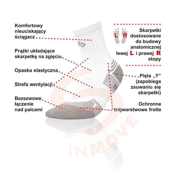 Skarpetki przeznaczone do intensywnego uprawiania sportu, dopasowane do anatomicznego kształtu lewej (L) i prawej (R) stopy. Na śródstopiu znajduje się opaska elastyczna, zapobiegająca przesuwaniu się skarpetki nawet podczas gwałtownych ruchów. Trójwarstwowa dzianina frotte chroni części stopy narażone na otarcia lub urazy. Przewiewna dzianina nad stopą ułatwia oddychanie i odprowadzanie ciepła. LYCRA® w całym wyrobie zapewnia znakomite przyleganie do nogi. Odpowiednio wyprofilowana dzianina na pięcie (kształt "Y") doskonale przylega do stopy i stabilizuje ją. Bezszwowe łączenie zapewnia maksymalny komfort, zapobiegając powstawaniu otarć nad palcami, nawet w ekstremalnych warunkach. Zawartość srebra w przędzy PROLEN® SILTEX sprawia, że skarpetki pełnią rolę dezodorantu. Unikalne antybakteryjne i antygrzybicze działanie srebra zapobiega powstawaniu przykrego zapachu podczas użytkowania i zapewnia maksymalną higienę i komfort użytkowania skarpetek.