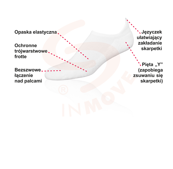 Damskie stopki sportowe z trójwarstwową dzianiną frotte, chroniącą wrażliwe części stopy, z przewiewną dzianiną nad stopą i nowoczesnym włóknem LYCRA® w całej cholewce. Opaska elastyczna na śródstopiu zapobiega przesuwaniu się skarpetek nawet podczas gwałtownych ruchów. Odpowiednio wyprofilowana dzianina na pięcie (kształt "Y") doskonale przylega do stopy i stabilizuje skarpetkę. Bezszwowe łączenie nad palcami zapewnia maksymalny komfort, zapobiegając powstawaniu otarć nad palcami. Skarpetki posiadają właściwości antybakteryjne, antygrzybicze oraz antyzapachowe, zapewniając maksymalną higienę użytkowania.