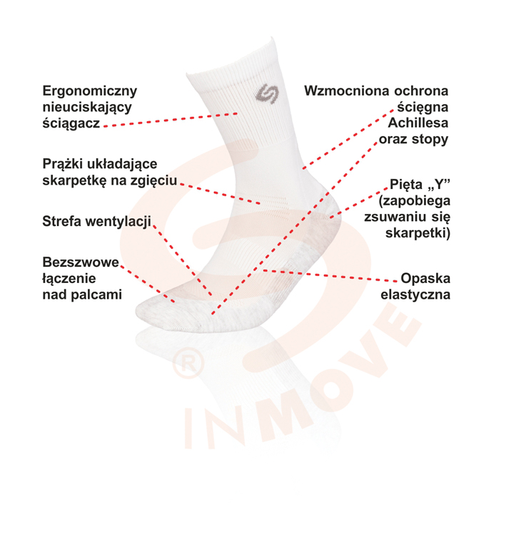 Uniwersalne, cienkie skarpetki sportowe, doskonałe do uprawiania sportu w upalne dni. Przeznaczone zarówno do tradycyjnego obuwia sportowego, jak i niższego, o lżejszym charakterze. Wzmocniona dzianina chroni spód stopy i ścięgno Achillesa. Wykorzystanie nowoczesnej konstrukcji włókna PROLEN® SILTEX sprawia, że wilgoć odprowadzana jest do warstw oddalonych od skóry, zaś stopy pozostają zawsze suche. Nad palcami znajduje się strefa wentylacji, co wraz z działaniem przędzy PROLEN® SILTEX dodatkowo przyspiesza odprowadzanie wilgoci. Nowoczesne włókno LYCRA® w całym wyrobie zapewnia komfortowe przyleganie skarpetki do nogi. Opaska elastyczna na śródstopiu oraz dzianina na pięcie wyprofilowana w kształt "Y", zapobiegają przesuwaniu się skarpetki nawet podczas gwałtownych ruchów. Poprzeczne prążki ułatwiają składanie się skarpetki na zgięciu stopy. Bezszwowe łączenie nad palcami zapewnia maksymalny komfort, zapobiegając powstawaniu otarć. Zawartość srebra w przędzy PROLEN® SILTEX sprawia, że skarpetki pełnią rolę dezodorantu. Bakteriobójcze i grzybobójcze działanie srebra zapobiega powstawaniu przykrego zapachu i zapewnia maksymalną higienę oraz komfort użytkowania.